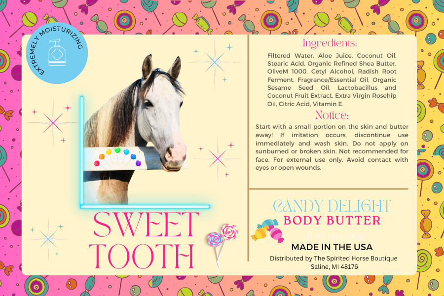 Step into the Stable Moisturized & Sugared Up with our Candy Delight Body Butter. Indulge in a pampering experience with our wonderful body butter inspired by our gorgeous horse Arlo who has the biggest, sweet tooth around. His favorite treats include candy, gummies, and sours! Immerse yourself in the delightful candy scent that’s sweet and light. This gentle sweetness will help you feel nourished. Celebrate this milestone with Arlo and treat yourself in the process.